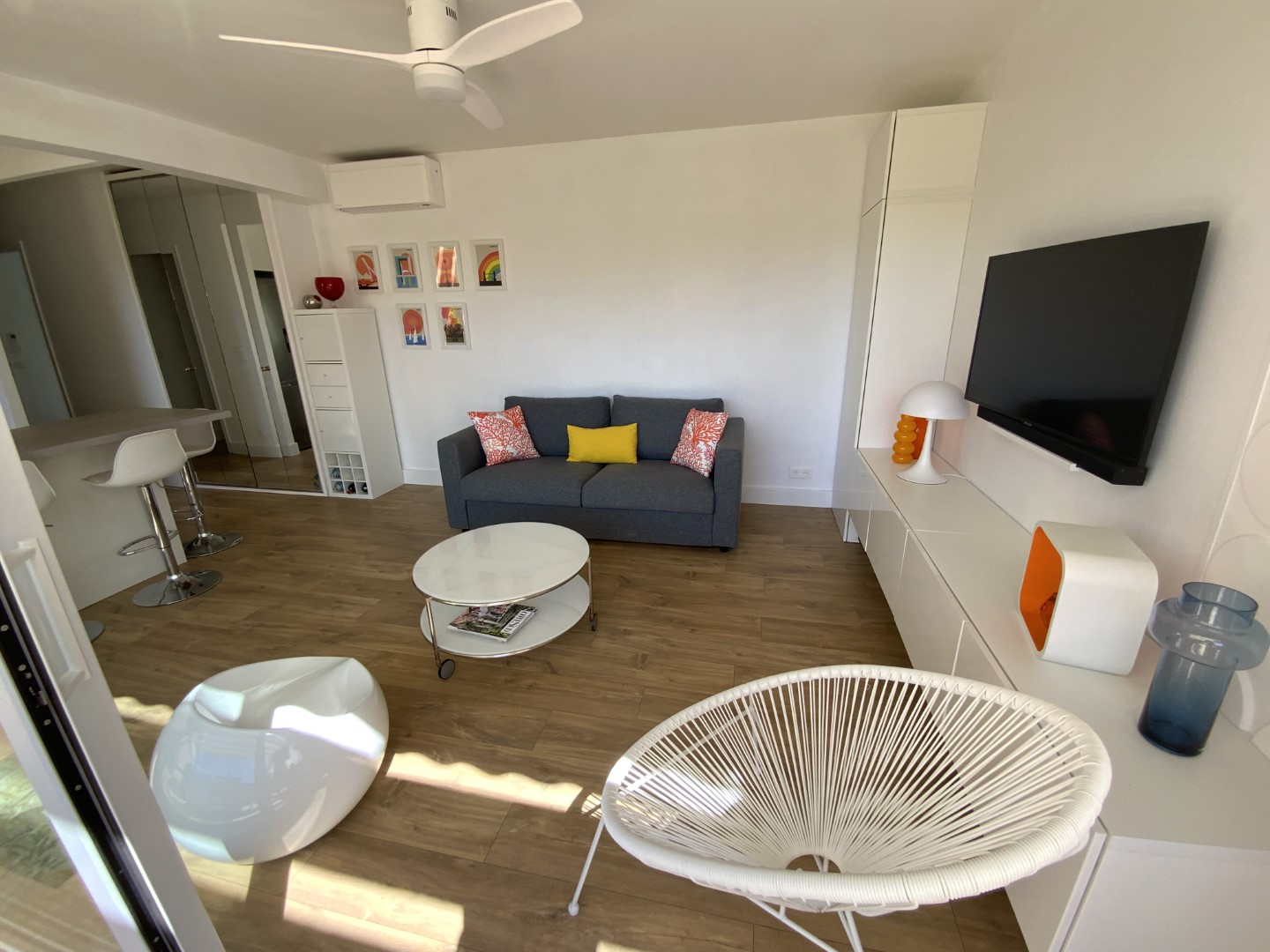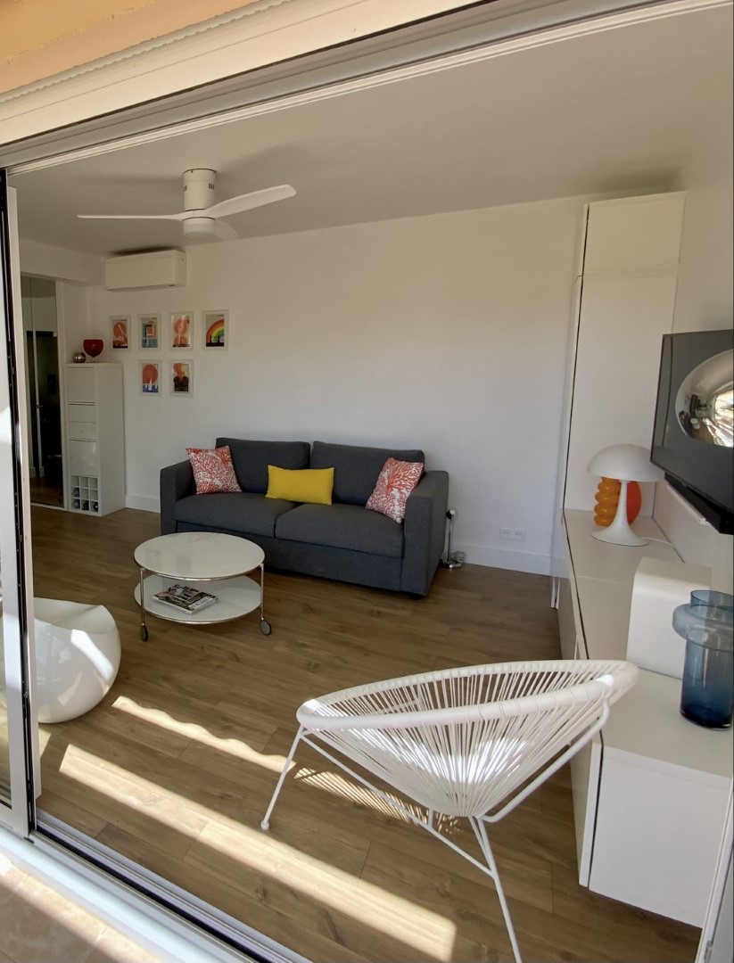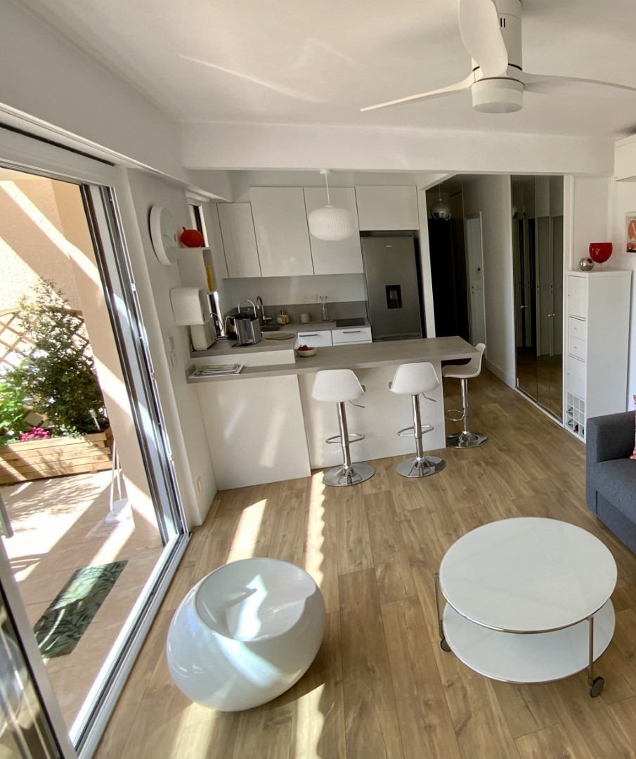 L'appartement, rénové avec goût, allie modernité et confort : une chambre avec lit double, une salle d'eau contemporaine avec douche à l'italienne, un salon-séjour lumineux s'ouvrant sur une terrasse sud-est offrant une vue dégagée.